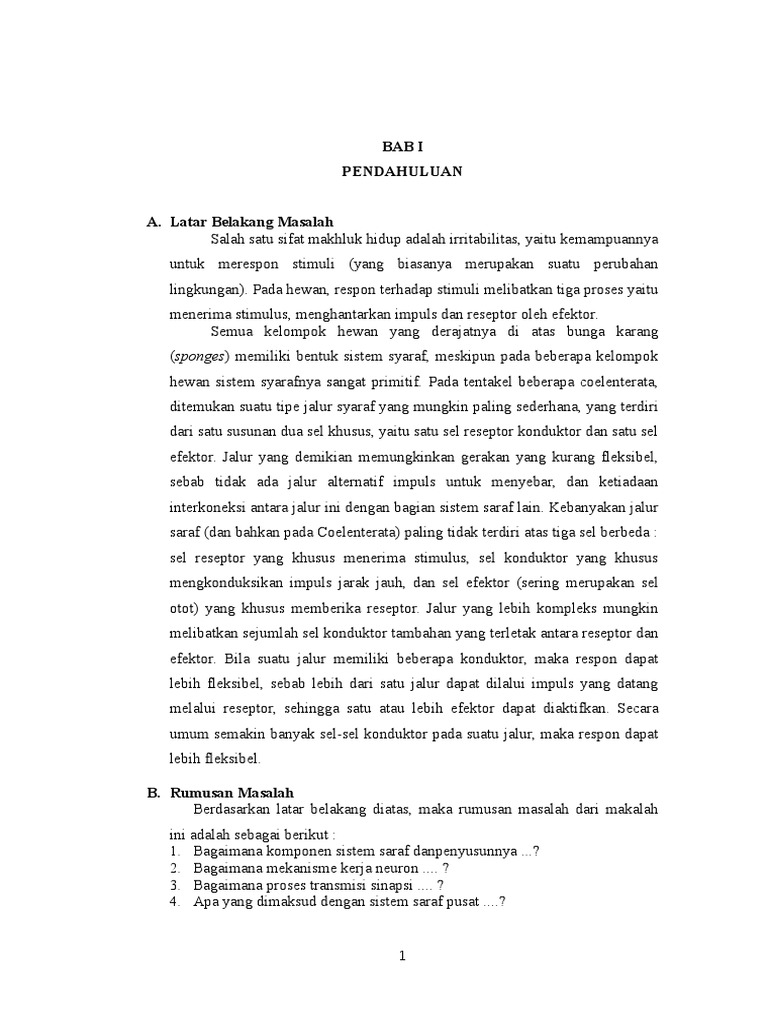 Makalah Sistem Saraf from imgv2-2-f.scribdassets.com Text of makalah sistem saraf edit.doc. Salah satu sifat makhluk hidup adalah irritabilitas, yaitu kemampuannya untuk merespon stimuli (yang. Sistem saraf merupakan suatu struktur yang paling sempurna yang dimiliki oleh manusia. Bab i pendahuluan 1.1 latar belakang berbeda dengan tumbuhan, hewan mempunyai daya gerak. Sistem saraf pada manusia, salah satunya adalah otak sebagai bagian dari sistem saraf, mengatur dan mengkoordinir sebagian besar gerakan, perilaku dan fungsi tubuh. So please help us by uploading 1 new document or like. Sistem saraf pada manusia terbaru lengkap,sistem saraf pada manusia, sistem saraf pada oleh karena itu, dalam makalah ini akan dibahas tentang sistem saraf. Sistem saraf merupakan salah satu bagian yang menyusun sistem koordinasi yang bertugas menerima rangsangan.